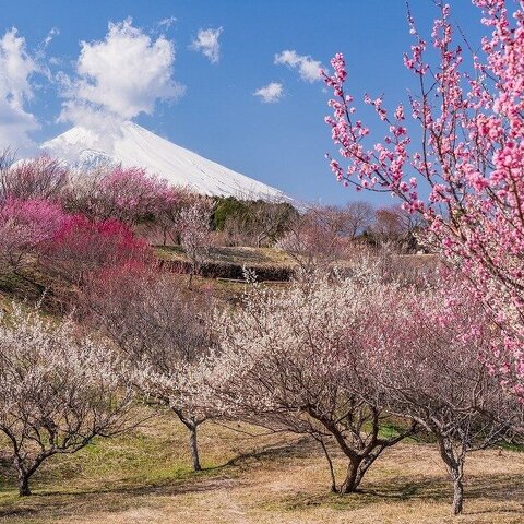 梅から桜まで、雅やかな春の花と富士山の絶景が楽しめる公園です。ロウバイ137本、梅300本、桜310本あり...