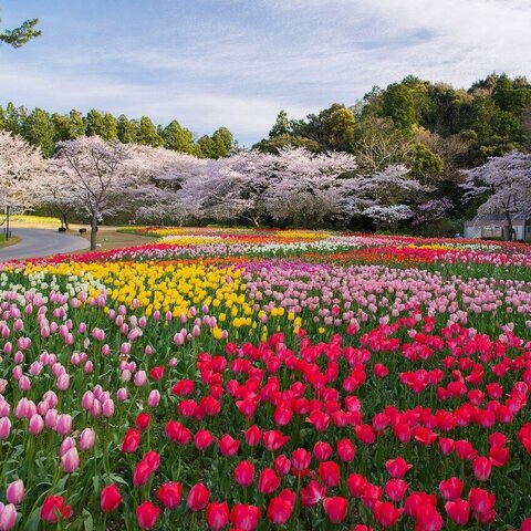 水仙8万球、チューリップ50万球、桜1,300本、藤(野田九尺藤棚80m、白藤棚70m、八重黒竜、他鉢植え)、...