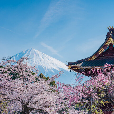 日蓮正宗総本山の大石寺。境内には5,000本の桜がある名所。富士山を背景にした桜の写真が有名なスポット...