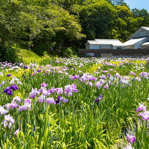 600品種50万本もの花菖蒲を保存・栽培する施設。極早咲き品種もあり、4月末から開花します。アジサイも...