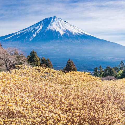 ミツマタを前景に富士山を見られる景勝地。菜の花は、約2000平方メートルの畑、バラは約300株74種類、ひ...