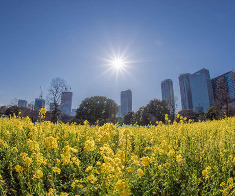 菜の花畑やキバナコスモス畑と高層ビル群が妙にマッチした景色が特徴。梅や紅葉も楽しめます。