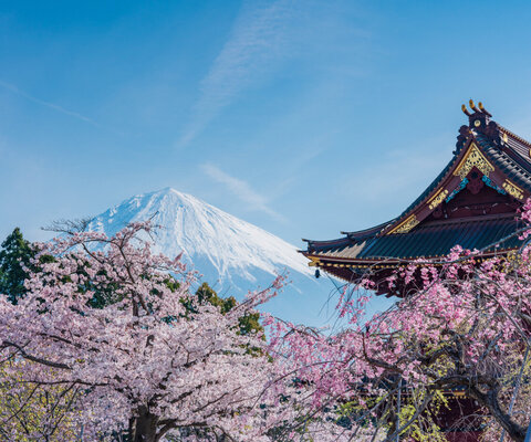 日蓮正宗総本山の大石寺。境内には5,000本の桜がある名所。富士山を背景にした桜の写真が有名なスポット...