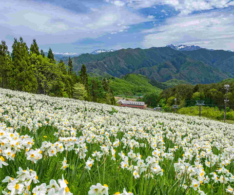 日本百名山である那須岳のある山並み背景に那須高原に広がるお花畑です。ゴールデンウィークから10月ま...