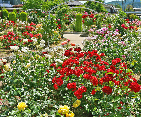 笛吹市にある日帰り温泉施設のみかさの湯。ローズガーデンがあり70種1,300株のバラが咲きます。