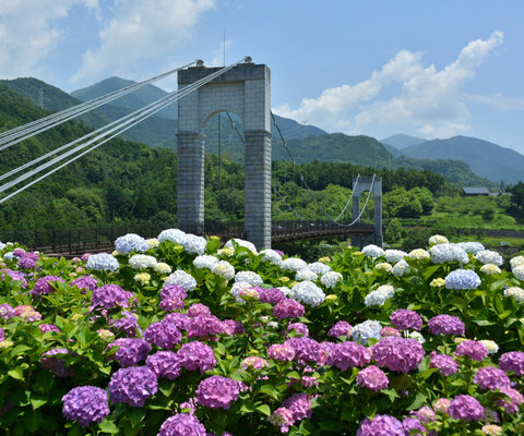 四季折々、いろいろな花が見られる公園です。紫陽花の時期は、「風の吊り橋」とのコラボショットが人気。