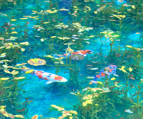 透明度の高い湧水の池に錦鯉が泳ぎ、睡蓮が咲くとまるでモネの代表作「睡蓮」のごとき景観となりSNSで人...