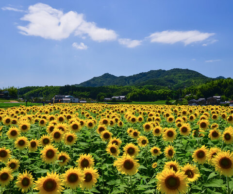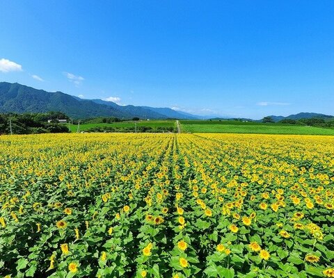 青い空と阿讃の山々を背景に、31万本を超えるひまわり畑を眺めることができます。