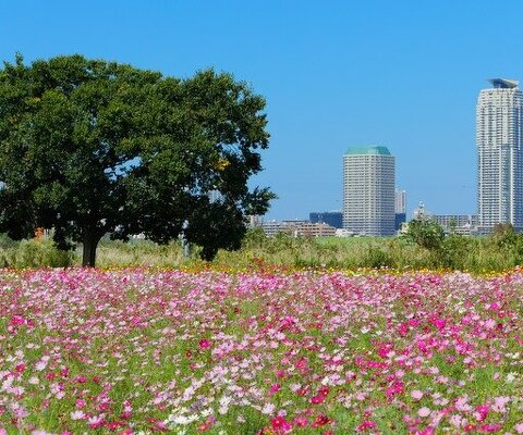 ビル群を背景に見晴らしの良い花畑です。河川敷大花壇では、春に桜とチューリップ、秋にコスモスが見ら...