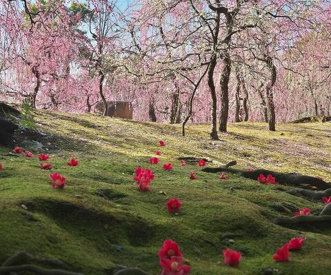 神苑 源氏物語花の庭にて、しだれ梅と椿が楽しめます。『源氏物語』に描かれた80種あまりの草木が随...