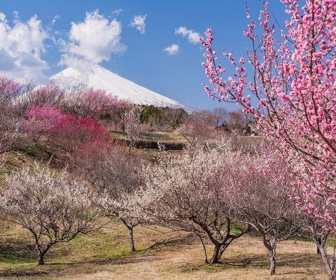 約700本の梅が咲く梅園。天気が良い日には、梅と富士山の競演が眺められます。真っ白な雪に覆われた富士...