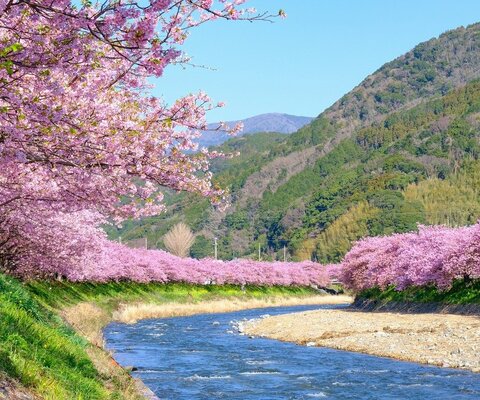河津桜発祥の地です。河津川沿いに850本、町全体で8,000本の河津桜が2月上旬から3月上旬まで咲きます。