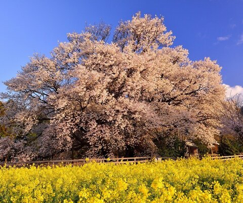 武雄市(たけおし)にある樹齢120年、樹高12mのヤマザクラです。市指定天然記念物です。周囲には菜の花...