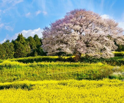 南阿蘇村の菜の花に囲まれた樹齢400年、樹高14mのヤマザクラの巨木です。背景は雄大な阿蘇の山並みで、...