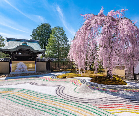 波心庭(はしんてい)と呼ばれる方丈庭園の周辺に見事な桜が咲き誇ります。プロジェクションマッピング...