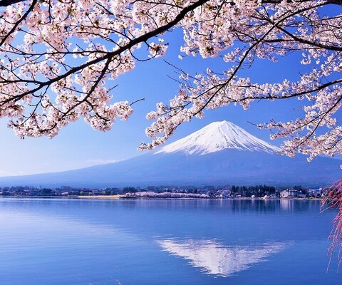 河口湖北岸エリアの湖畔にソメイヨシノが約200本植えられており、河口湖に映る富士山を桜越しに眺めるこ...