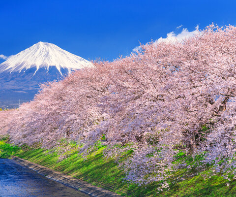 潤井川(うるいがわ)沿い約250mに渡って咲き誇る見事なソメイヨシノと、背景には残雪の富士山が望める...