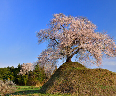 田畑の中の小高い丘の上に咲く一本桜。樹齢150年とも200年ともいわれていますが、不詳。