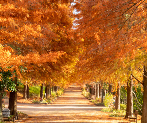 桜の園には1,000本のソメイヨシノ、バラ園にはモダンローズ中心に95種2,000株のバラ。秋になると落羽松...