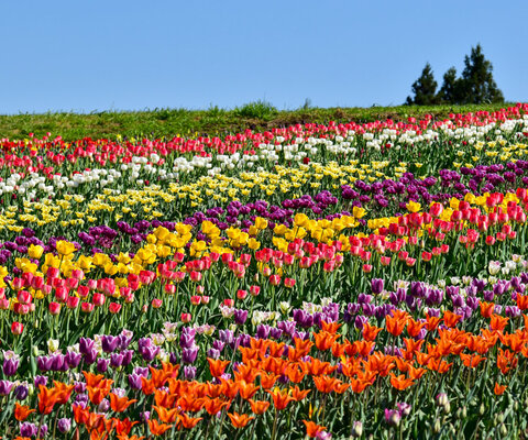 桜16種1,000本、チューリップ140種65万株、バラ26品種500株、ひまわり15万本、花菖蒲100品種3万株、コス...