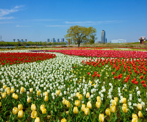 風車前花壇に30,000本といわれるチューリップが咲く。夏には花蓮園で200種ほどの蓮が咲きます。地元の育...