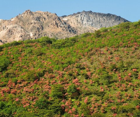 一関市室根町、北上高地の標高895mの独立峰です。春は約20万本のツツジやレンゲツツジが咲きます。山全...