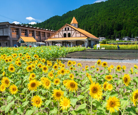 三ノ倉高原のスキーゲレンデを利用した花畑。春には菜の花(350万本)、夏にはひまわり(250万本)、秋...