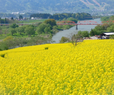 唱歌「おぼろ月夜」の舞台と言われる菜の花畑。長閑な風景の中、あちらこちらに鮮やかな菜の花畑が広が...