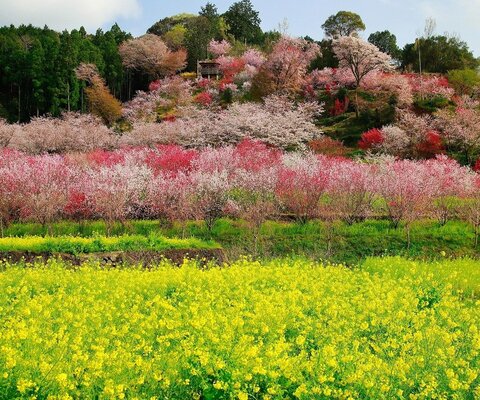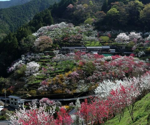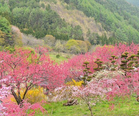 元棚田だった場所が耕作放棄地となり花木を植えて現在の姿に。花桃、山茱萸(サンシュユ)、山桜が見事...