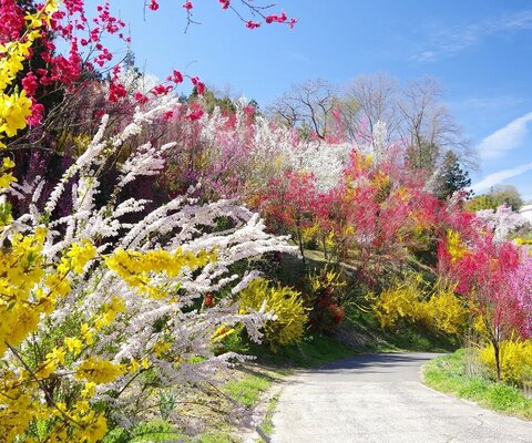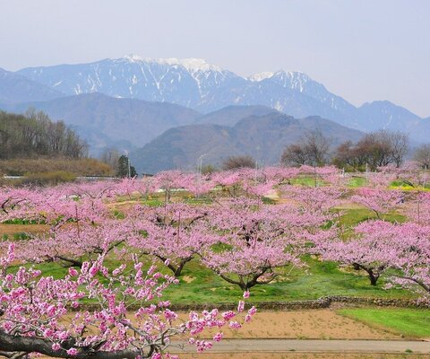 信州、武石余里(たけしより)に4km(一里)にわたり、2,000本の花桃が咲きます。赤、白、ピンクの花が...