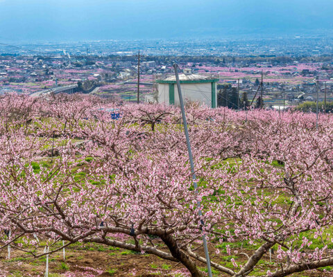 中央高速道路釈迦堂パーキングエリア付近から眺める町は一面の桃畑。下り線側にある博物館裏手にある駒...