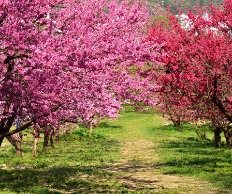 40品種、約300本のハナモモが咲きます。夜にはライトアップも実施。