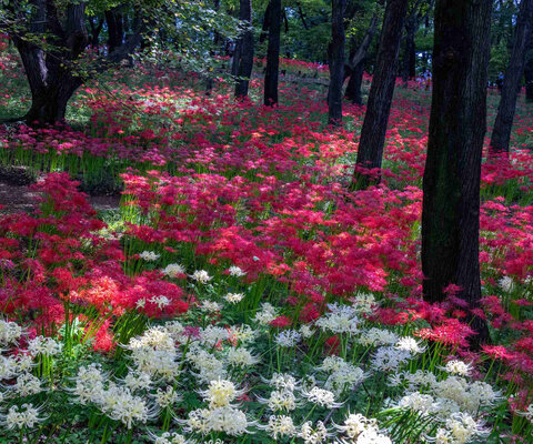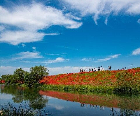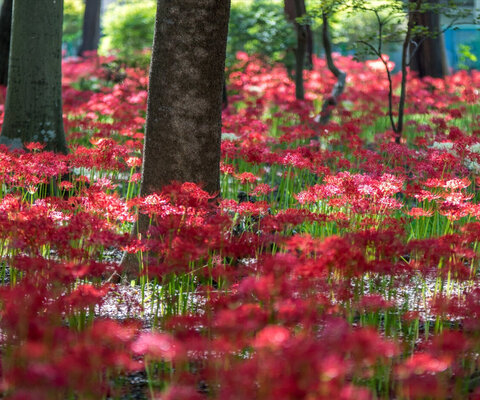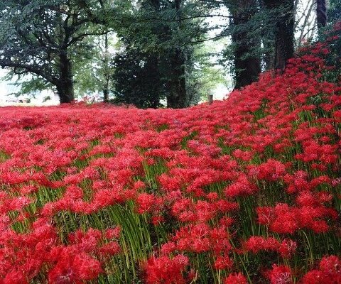 9月中旬から下旬にかけて真っ赤な彼岸花が一面に広がり、まるで絨毯のような光景を楽しむことができます。