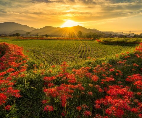 山間に棚田が広がる原風景に50万本の彼岸花が咲きます。