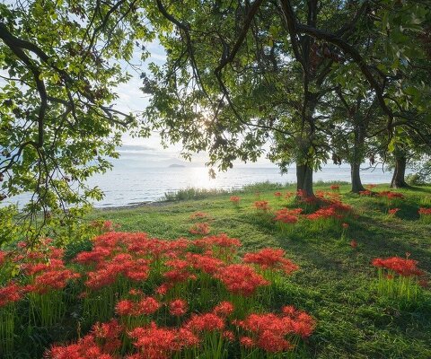琵琶湖の畔で群生する彼岸花。水辺で咲く花々に癒されながら穏やかな時間を過ごせます。