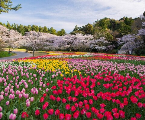 日本さくら名所100選に選出。敷地約7万m2に、ツツジ、梅、牡丹、藤、ミモザ、薔薇など500種以上の花が...