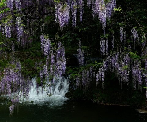 傾斜地にまるでナイアガラの滝のように野性味あふれる藤が咲く藤園です。