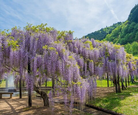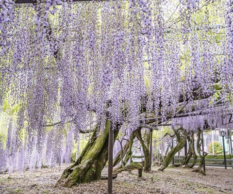 小高い斜面に広がる圧巻の大藤棚は250本のフジからなる、約2400坪もある実質日本一の規模。斜面に植えら...