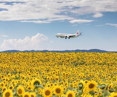 ひまわり畑の上を飛ぶ飛行機の写真を撮影できる、人気のスポットです。