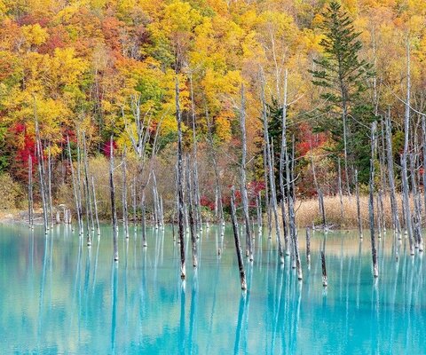 十勝岳の火山泥流を防ぐためにつくられた堰堤によって美瑛川の左岸にできた人造池です。ビエイブルーの...