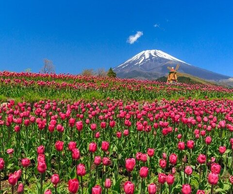 富士山2号目にある天空のお花畑。春のチューリップと晩夏のダリアはおすすめです。