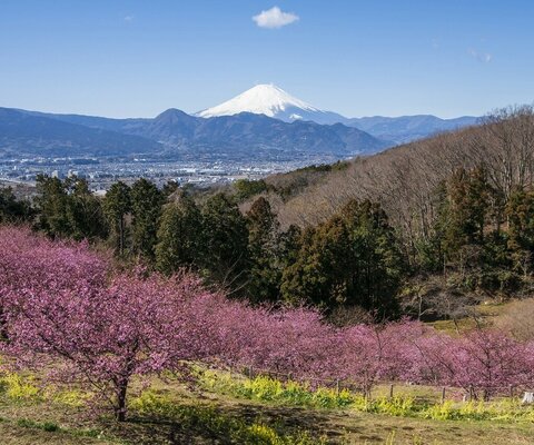 梅から桜まで、雅やかな春の花と富士山の絶景が楽しめる公園です。ロウバイ137本、梅300本、桜310本あり...