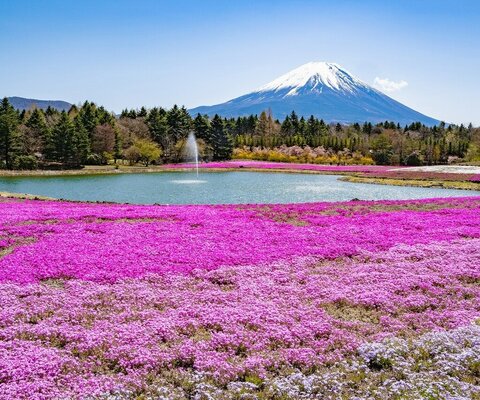 首都圏最大級の規模で富士山を背景に約50万株の芝桜の絨毯が広がります。本栖湖周辺の自然に囲まれた...