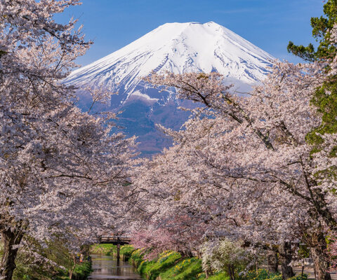 潤井川(うるいがわ)沿い約250mに渡って咲き誇る見事なソメイヨシノと、背景には残雪の富士山が望める...