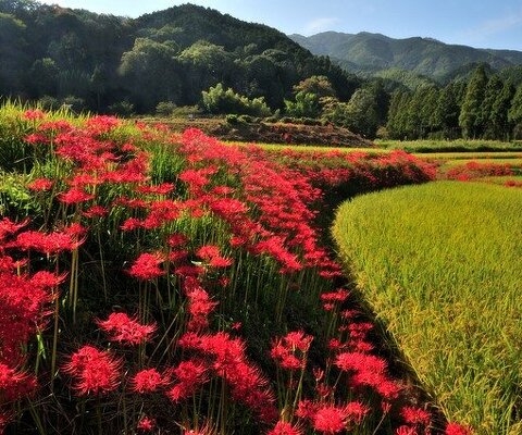 棚田の畔や土手一面を彼岸花が真っ赤に染める風景は見事です。