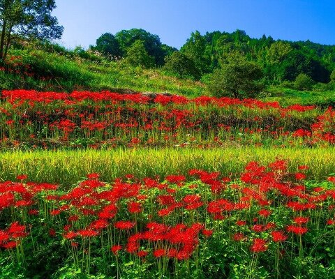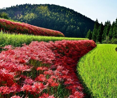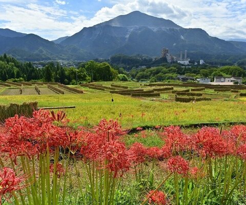 山間に棚田が広がる原風景に50万本の彼岸花が咲きます。