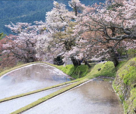 500本の山桜が咲く国指定名所で、「さくら名所100選」にも選ばれています。棚田の風景と調和した景色が...