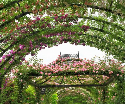 「バラの小径」は、約60品種480本のツル薔薇による全長340.5mのトンネルで、日本一の長いバラのトンネル...