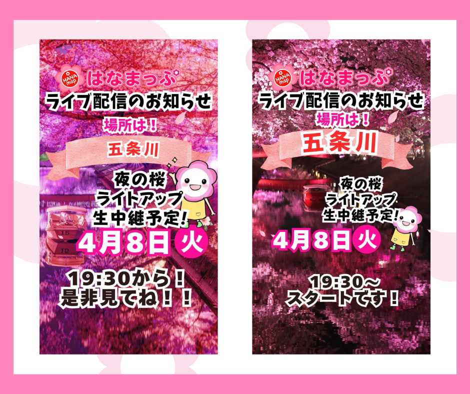 2025年04月07日(月) 新着情報 五条川 インスタライブのお知らせ 4/8火 19:30スタート 愛知県 五条川からインスタライブを配信いたします。 夜桜のライトアップの様子をお届けします。 ぜひご覧ください。 五条川 はなまっぷのページ