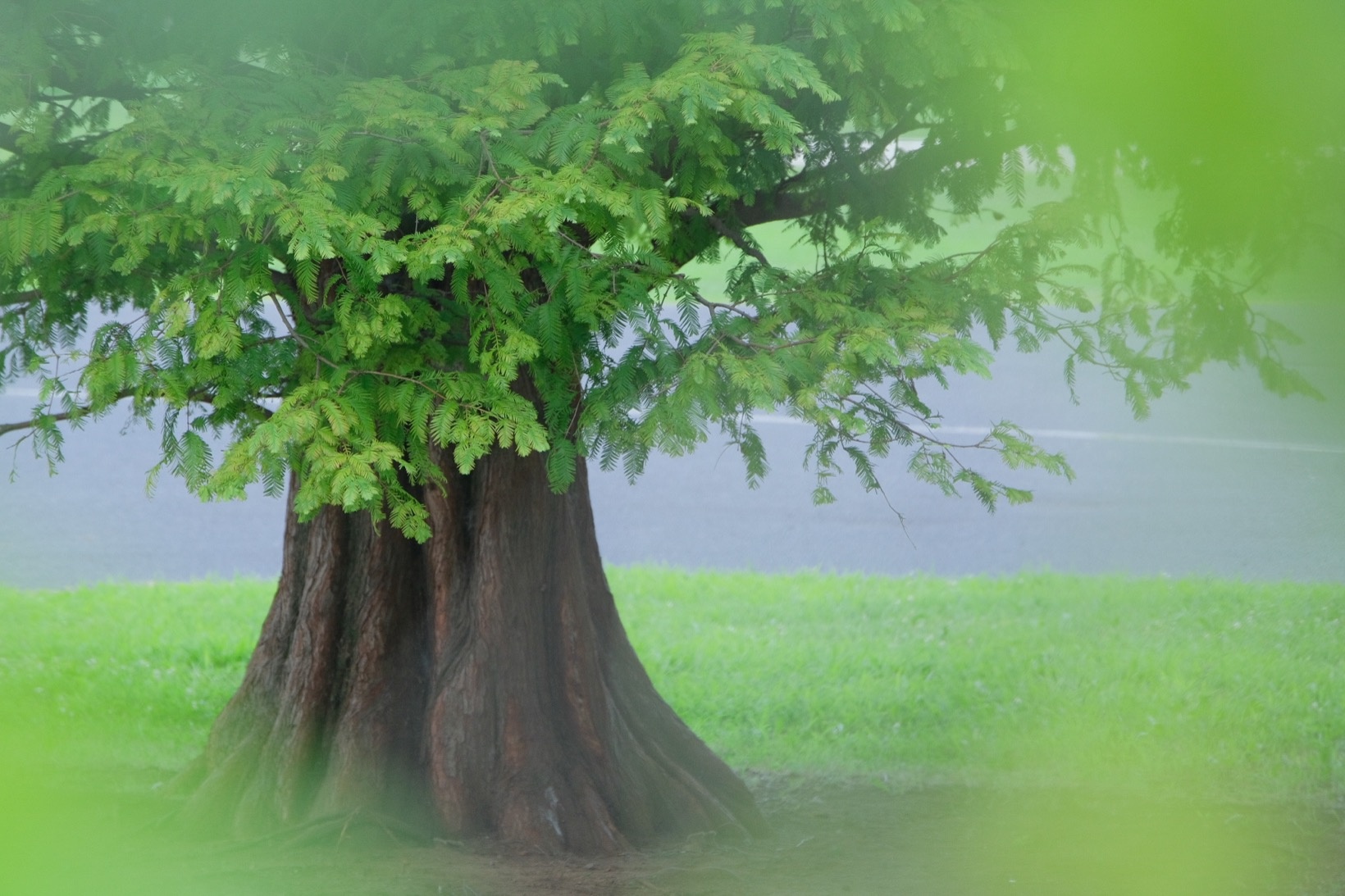 こちらは、インスタ映え講座で前ボケの練習用に撮影した1枚。花みどり文化センターの前にあるゴーヤの葉っぱを前ボケに、後ろに立つ木を撮影しました。